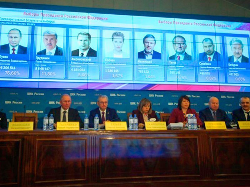 Объявление предварительных результатов голосования АГН "Москва" / фото: Ведяшкин Сергей Действующий президент России Владимир Путин победил на выборах главы государства 18 марта 2018 года. Как сообщил Центризбирком после обработки 99,9% протоколов голосования, Путин набрав рекордные 76,68% голосов. Его ближайший соперник Павел Грудинин, выдвигавшийся от КПРФ, набрал 11,78% голосов. Лидер ЛДПР Владимир Жириновский получил 5,65% голосов избирателей.
