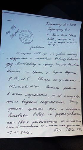 16-го марта утром я пошёл на почту, чтобы получить посланную из Москвы на моё имя бандероль с продуктами, памперсами и лекарствами для моих больных престарелых родителей. На сайте "Почта России" в разделе "отслеживание" я накануне прочитал порадовавшую меня информацию: "Отправление ожидает адресата в месте вручения 15 марта 2018, 11:47 303200, Кромы, 25 Октября ул, 30.Для получения нужно предъявить удостоверение личности и заполнить извещение."