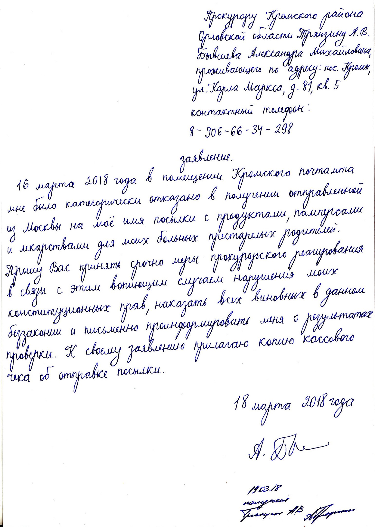 Заместитель начальника Кромского почтамта оригинально объяснила ситуацию: "Вы находитесь под особым контролем." А потом добавила: "Если бы Вы не писали заявления по поводу недоставленной Вам из Киева посылки, всё было бы нормально." (Моя двоюродная тётя ещё в декабре 2017-го решила сделать мне новогодний подарок и послала мне небольшую коробку, куда положила книгу, шарф и ещё некоторые предметы зимней одежды, потому что я страшный мерзляк и поэтому не люблю пушкинское "Здоровью моему полезен русский холод." А поскольку её подарок я так и не получил, то имел "наглость" написать на имя начальника Кромской почты заявление, где вежливо спрашивал, по какой такой причине данная посылка до меня не дошла и когда мне её собираются передать.) Впрочем, бандероль из Украины мне так и не вручили. Видимо, эта моя жалоба и стала последней каплей, которая переполнила чашу терпения моих высокопоставленных земляков. Кстати, мой адвокат совершенно уверен, что данное самоуправство есть инициатива местных органов, которые решили вот таким образом показать собственную лояльность и активность в борьбе с "нацпредателем" (тем более накануне "президентских выборов") перед вышестоящими товарищами, надеясь на некие бонусы за своё служебное рвение. В связи с данным фактом абсолютного беззакония мне пришлось написать заявление главному кромскому прокурору господину Трянзину А.В., который, по иронии судьбы, сейчас возглавляет сторону обвинения на процессе в Тросне по моему третьему уголовному делу и успел уже возбудить против меня очередное четвёртое. Посмотрим, что мне ответят наши "славные блюстители закона." В общем, у доблестной Кромской прокуратуры сейчас появился великолепный шанс попытаться подтвердить на деле слова Путина о том, что сегодняшняя российская правоохранительная система является одной из лучших в мире. Будем внимательно следить за ходом прокурорского реагирования. Продолжение следует.