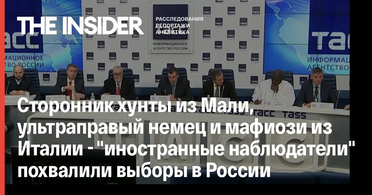 Вскоре после оглашения результатов «президентских выборов» программа «Время» на «Первом канале» показала сюжет, в котором международные наблюдатели расхваливали выборы за честность и прозрачность. Присмотревшись к наблюдателям, The Insider узнал в них некоторые знакомые имена. The Insider уже не раз писал о том, как под видом иностранных наблюдателей по России гастролирует команда, включающая представителей ультра-правых движений, карликовых партий и просто политических фриков). В этот раз, однако в этой команде обнаружились некоторые новые имена. The Insider обратил внимание на некоторых из них.