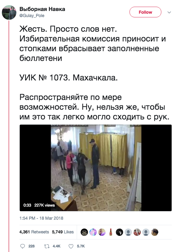 Среди распространяющихся в социальных сетях роликов, демонстрирующих нарушения на выборах, весьма популярно видео с махачкалинского участка, где члены избиркома стопками вбрасывают заполненные бюллетени в урны.