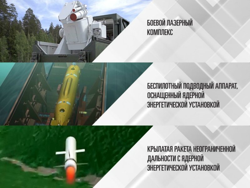 Минобороны подвело итоги голосования за названия новых видов вооружения — боевого лазерного комплекса, беспилотного подводного аппарата, оснащенного ядерной энергетической установкой, и крылатой ракеты неограниченной дальности с ядерным двигателем.