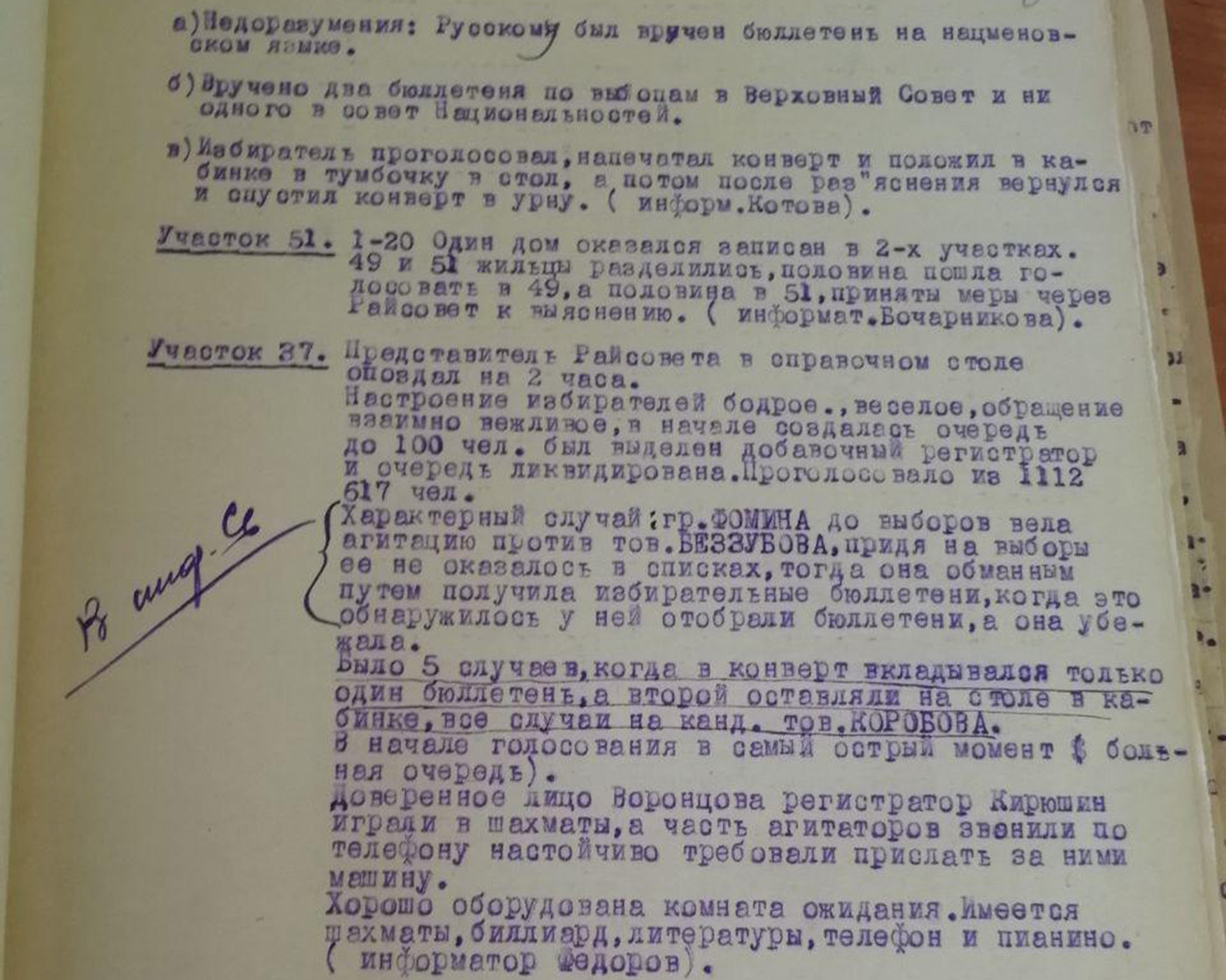 Обо всех членах комиссий и председателях, которые позволяли себе появляться на избирательных участках пьяными, тоже докладывали наверх. Одного председателя участковой комиссии и вовсе арестовали — он напился и не смог провести с населением беседу по разъяснению избирательного законодательства, а кроме того, как выяснило следствие, «приводил ночью в помещение избирательного участка женщин и ночевал с ними».