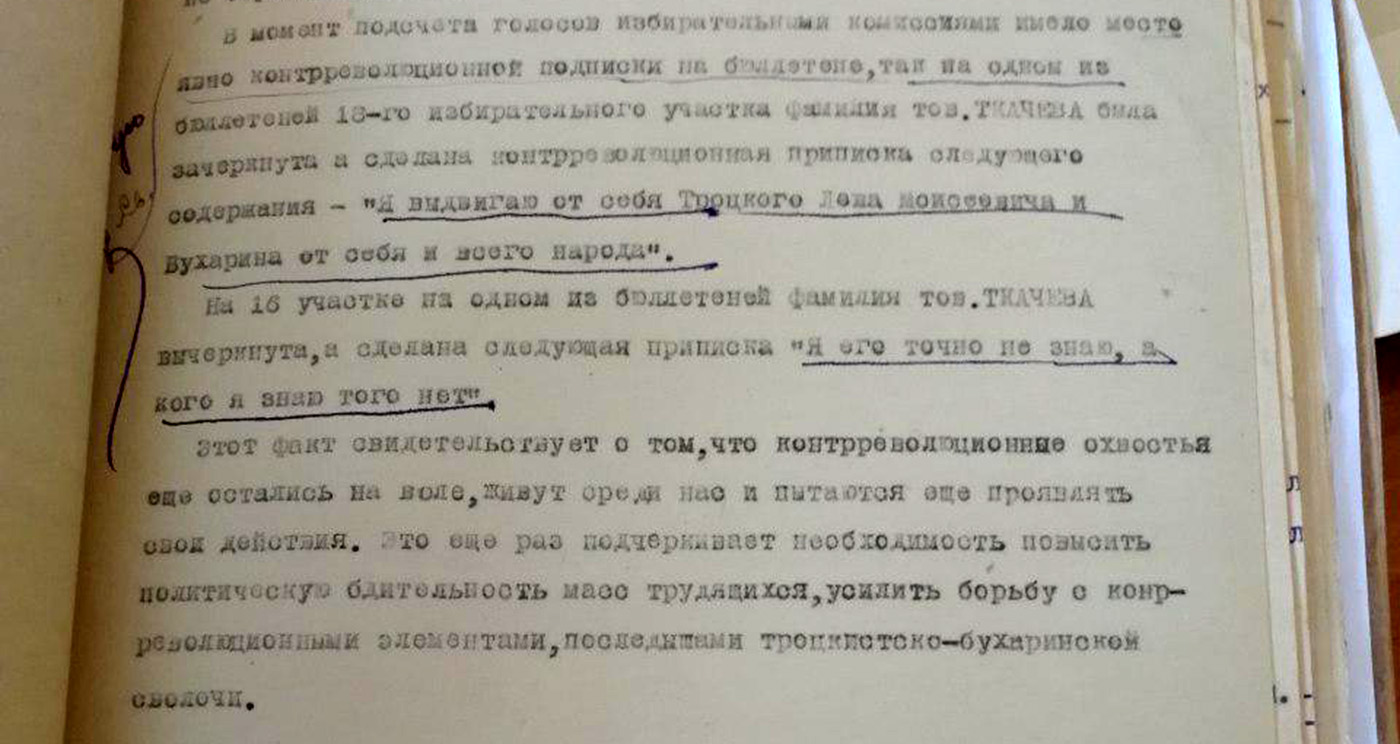 Впрочем, даже те, кто приходил на участки, были не столь единодушны в поддержке режима, как может показаться — уединившись в кабине для голосования, многие использовали бюллетень, чтобы записать на нем свои мысли о советской власти. В отчeтах по Оренбургской области говорится, что больше всего протестных надписей в 1937-м появлялось на бюллетенях, напечатанных на татарском языке. Одна из них переводится так: «Выбирай — не выбирай, а так или иначе будет избран». Часто, вне зависимости от языка, встречались надписи в поддержку изгнанного из страны Троцкого: «Я выдвигаю от себя Троцкого Льва Моисеевича и Бухарина от себя и всего народа...». Иногда фамилию оппозиционера просто вписывали поверх бюллетеня. Приходя на участки в разных уголках Оренбургской области, люди писали, что не понимают, за кого им предлагается голосовать: «Он ничем себя не проявил» или «Я его точно не знаю, а кого знаю, того нет».