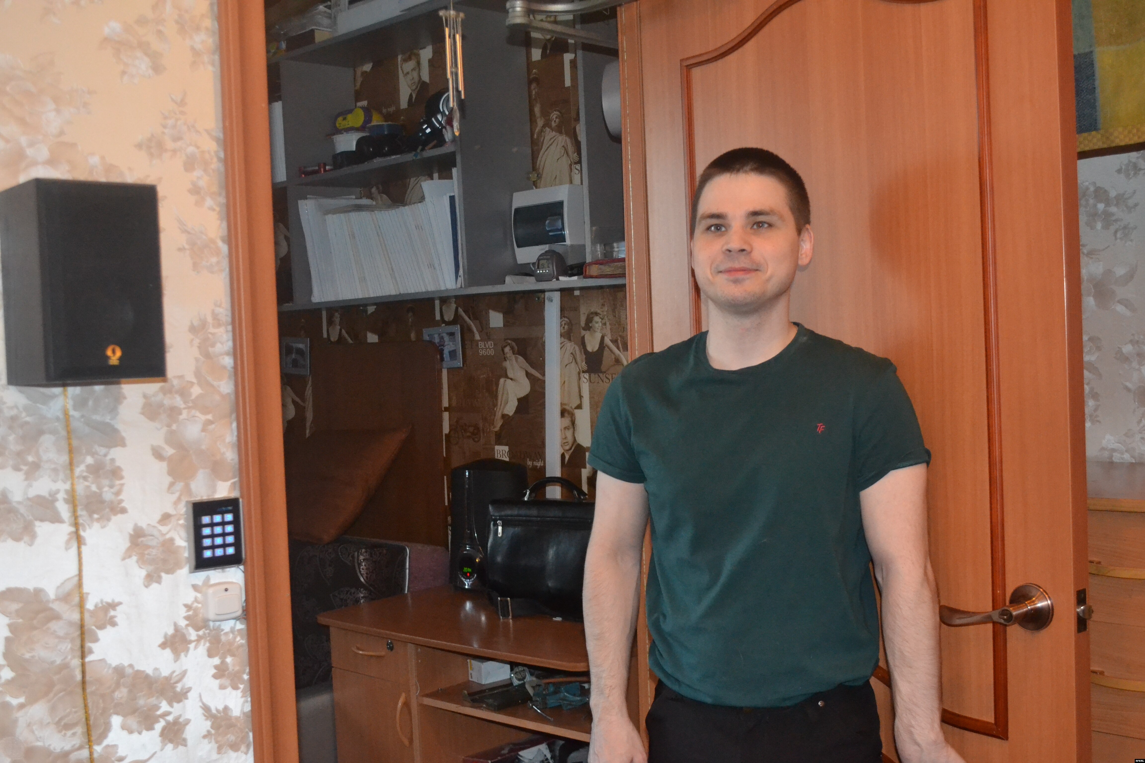 У входной двери квартиры Сергея Мильчакова – видеотелефон, кнопки, провода. Встречая гостей, Сергей рукой показывает на гардеробную, где можно раздеться. Там автоматически открывается дверь, включается свет и музыка.