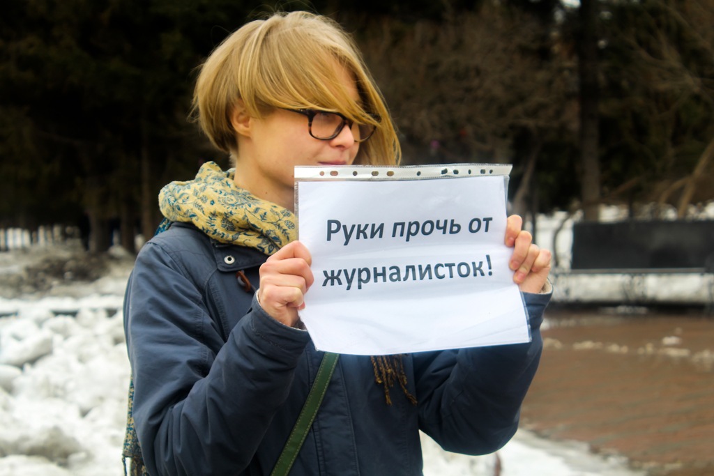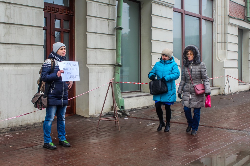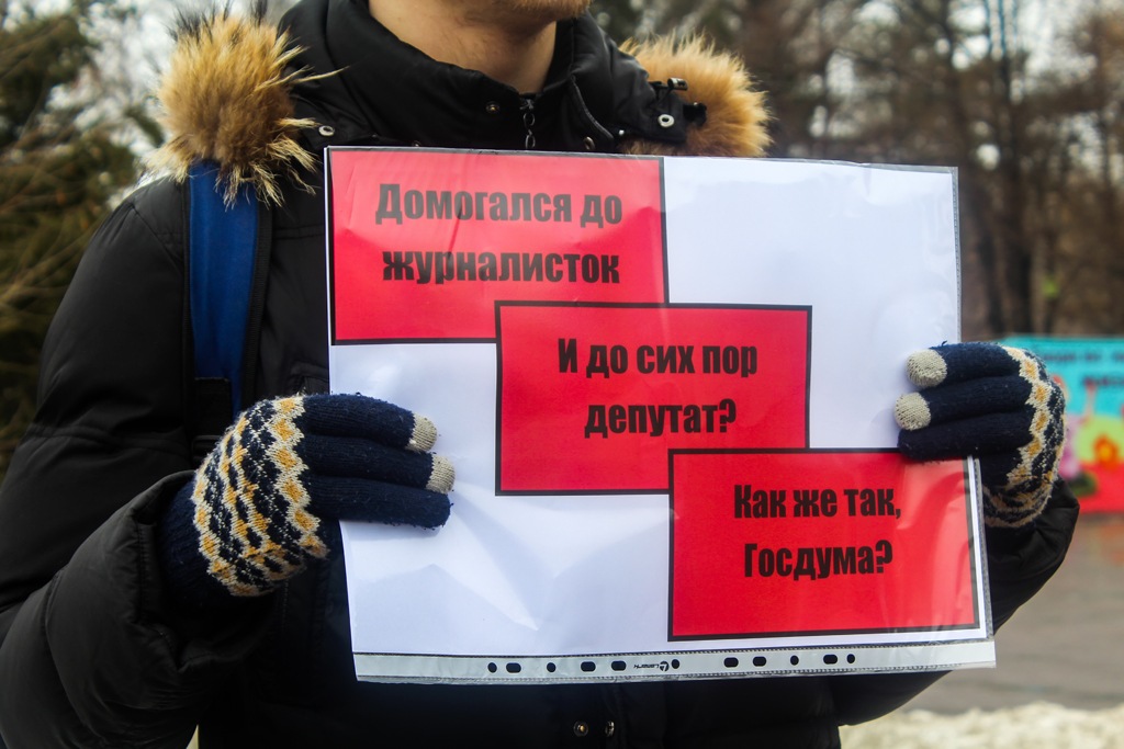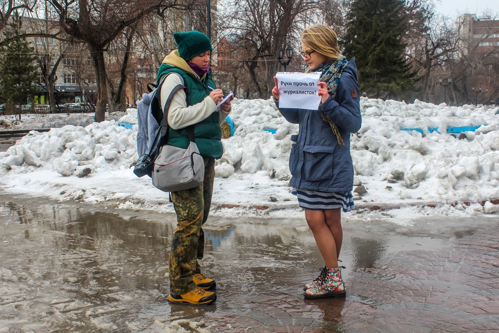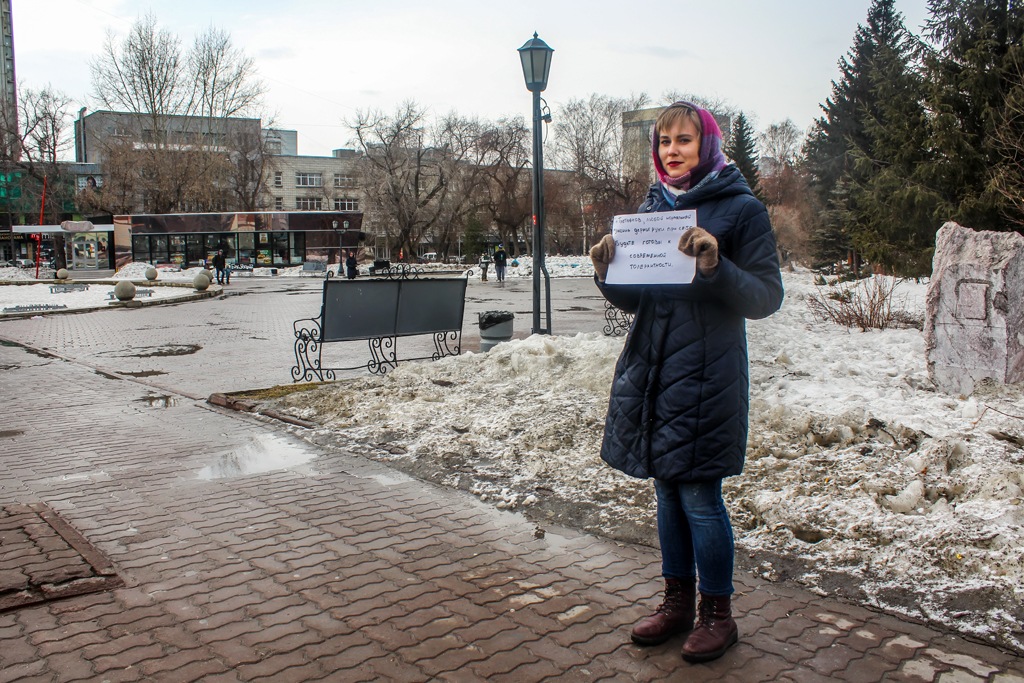 Одиночные пикеты проходят в центре Новосибирска 24 марта. Девушки и парни принесли плакаты, на которых, например, значилось: «Зайчутка, может тебе сдать мандат?», «Руки прочь от журналисток», «Комитет по этике оправдывает домогательства депутата Слуцкого. Вон из Думы», «За мандат себя хватай».