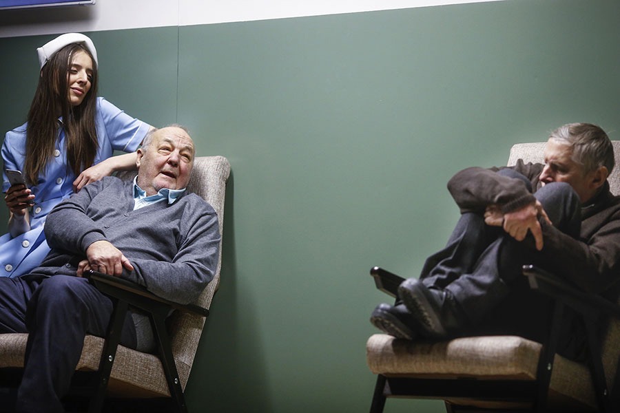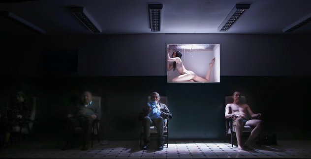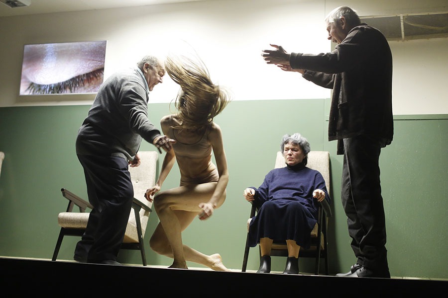 Давайте представим, что на сцене осталось бы то же самое. Пять артистов помещены в казённую обстановку какого-то коридора. Кафельный пол, над головой пять казённых ламп, кресла, расставленные у холодной стены… Как выразилась одна из зрительниц: то ли больница, то ли морг… Слов артисты не произносят, но спектакль не немой. Голоса записаны заранее. Из динамиков звучат отрывки рассказа Платонова, временами заглушаемые внушительной музыкой Владимира Бочарова.