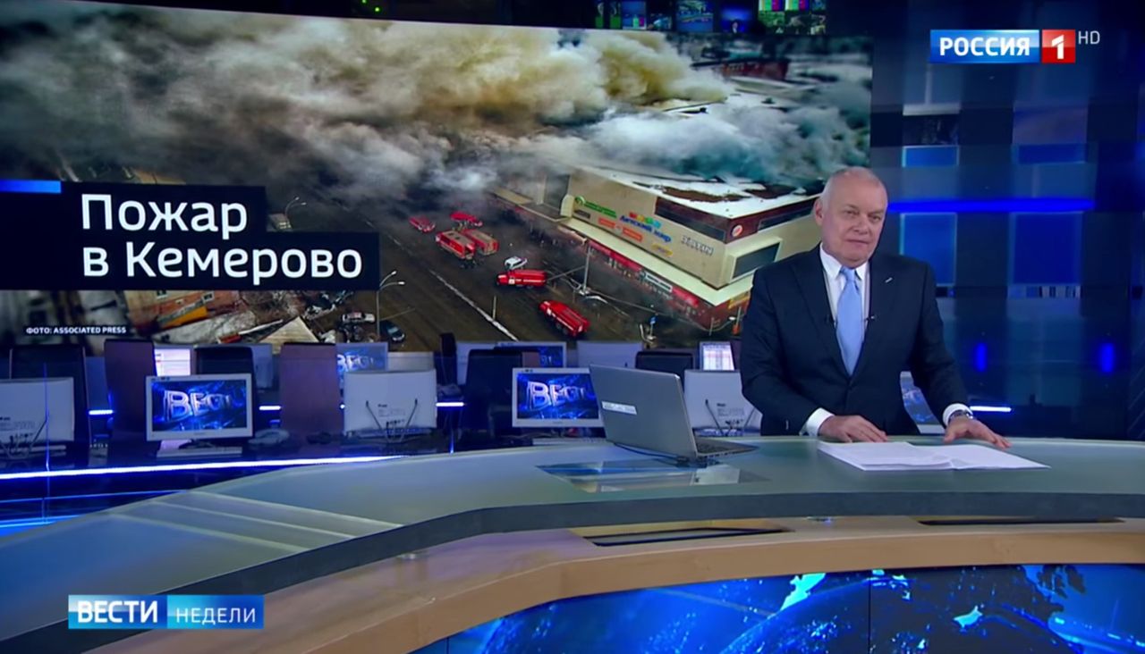 На «России 1» первые новости о Кемерово появились также только в итоговой аналитической программе «Вести недели». Причем в версии для Дальнего Востока, которая записывалась, когда пожар начинался, сюжета о Кемерово нет. В обновленной версии для европейской части России он идет сразу после первого репортажа об итогах выборов президента. Корреспондент телеканала вышел в прямой эфир из Кемерово и рассказал, что было известно к тому моменту. Сюжет занял более трех минут.