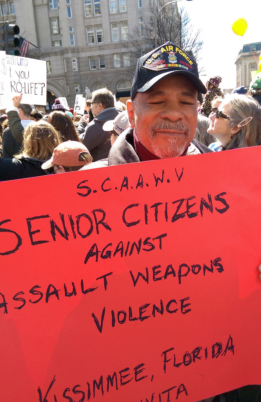 Участники военных действий тоже побывали на марше и продемонстрировали, что понимают опасность оружия гораздо лучше, чем обычные люди. Ветеран ВВС США Джесси Брукс, воевавший во Вьетнаме, привез из Флориды плакат «Старшее поколение против насилия с применением боевого оружия» (Senior Citizens Against Assault Weapons Violence). «Я хочу, чтобы это оружие запретили, ему нет места в нашем обществе», — сказал он NT. И продолжил: «Поверьте мне, я воевал во Вьетнаме, служил в военной полиции, и я хорошо знаю, каково это — когда убивают людей. И я знаю, что боевое оружие может применяться только для убийства людей, а не для охоты. Нам не нужно, чтобы оно у нас было».