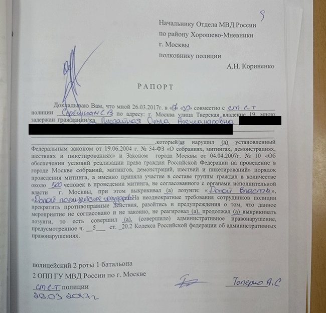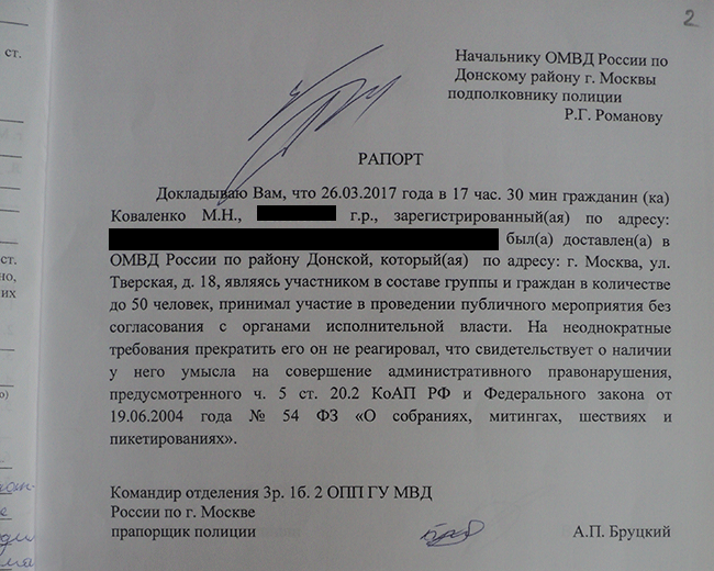 «У меня сложилось впечатление, что по 26 числу был заготовлен шаблон протоколов и рапортов. Там почти одинаковые описания общей фабулы произошедшего, вставлялись только разные фамилии задержанных и время их задержания. Когда 26 марта я ездил по ОВД, было видно, как полицейские сидят и пачками штампуют эти документы, — говорит Константин Маркин, адвокат, работавший в отделах полиции в день „АнтиДимона“ и позже в судах над задержанными на акции. — Шаблон был общий, а в каждом ОВД были свои нюансы. Всюду было написано, что человек вышел на несогласованную акцию, ему было предложено по громкоговорителю разойтись, он этого не сделал. Тем самым, он нарушил порядок проведения акций — это было практически во всех протоколах. Иногда одни и те же ошибки встречаются в разных протоколах. Особенно в печатных рапортах и объяснениях».