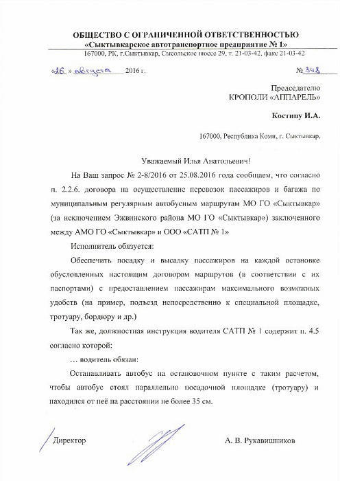 Руководство «Сыктывкарского автотранспортного предприятия № 1» («САТП 1») в августе 2016 года прислало Костину официальный ответ, в котором обещало, что автобусы будут останавливаться параллельно посадочной площадке и не дальше, чем в 35 сантиметрах от нее.