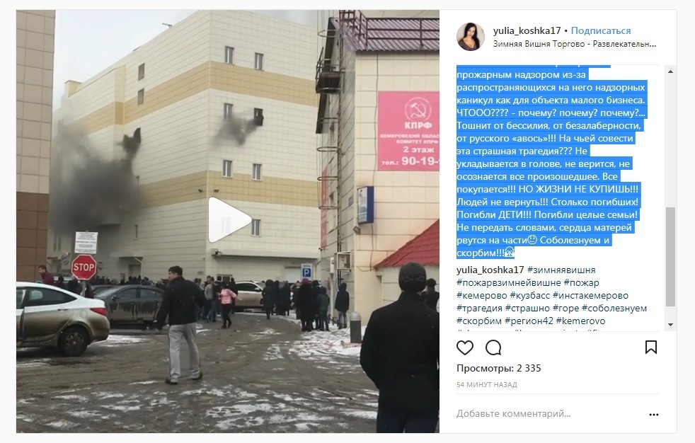 «25.03.2018 наш с сыном второй день рождения! — написала в инстаграме жительница Кемерова Анастасия. — Во время пожара в торговом центре „Зимняя вишня“ мы находились в киноцентре на последних местах в самом углу. Единственное, что помню: девушка крикнула, что пожар (даже пожарной тревоги не было). Было очень страшно выходить в эпицентр возгорания, не зная, что ждет тебя, и еще страшнее быть в замкнутом помещении. Взяв сына на руки, я намотала нам шарф, чтоб мы могли дышать, и пошла к выходу. Дышать было тяжело, и ничего не видно. Сын кричал, что мы умрем, я его успокаивала и шла вниз, где нас почти давили. Только на втором этаже я поняла, что мы спасемся. Мы остались без вещей, но главное, что мы живы. Господи, как было страшно. Родители, не оставляйте детей без присмотра. 25.03.2018 наш второй день рождения и большой траур для всех».