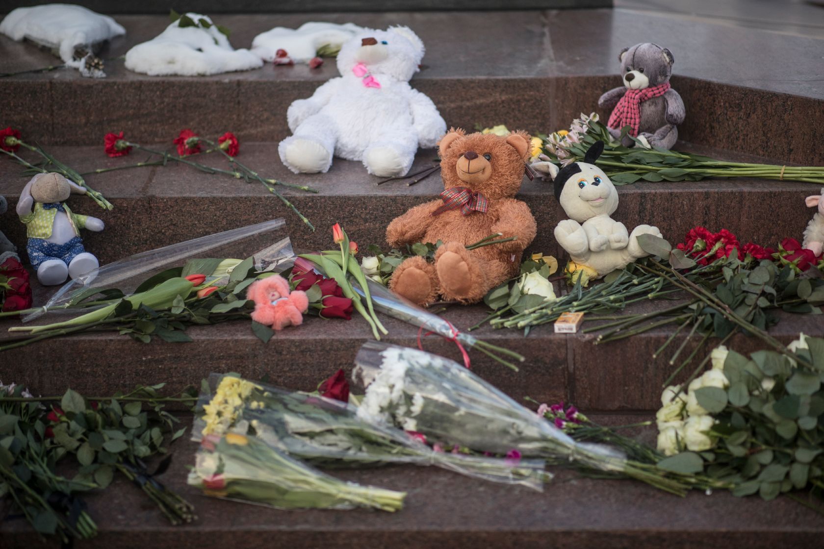 По всей видимости, акцию на Манежной готовили в спешке — мэрия сообщила о ней лишь в час дня, а в начале шестого, когда мероприятие уже официально началось, организаторы еще натягивали баннер с надписью «Кемерово, мы с тобой». Перед ним на длинном постаменте лежали мягкие игрушки с магазинными бирками на ушах, красные гвоздики, стояли лампадки, с которых не успели снять этикетки, и фотографии детей с заблюренными лицами.