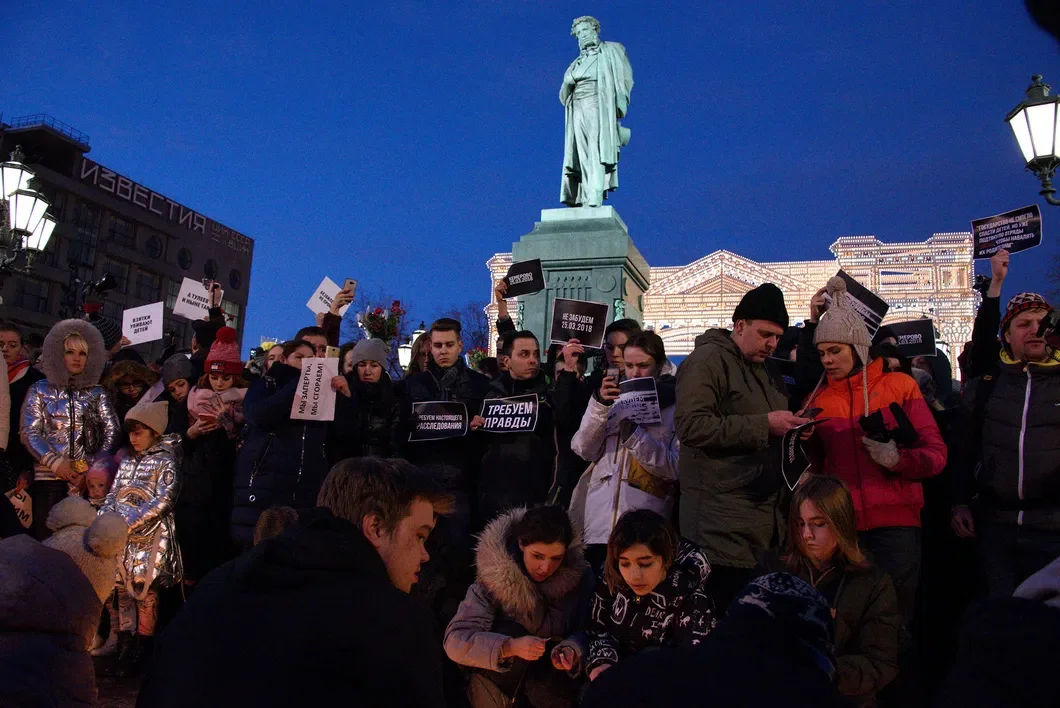В эти минуты в Москве на Пушкинской площади проходит акция памяти жертв пожара в торговом центре «Зимняя вишня» в Кемерове.