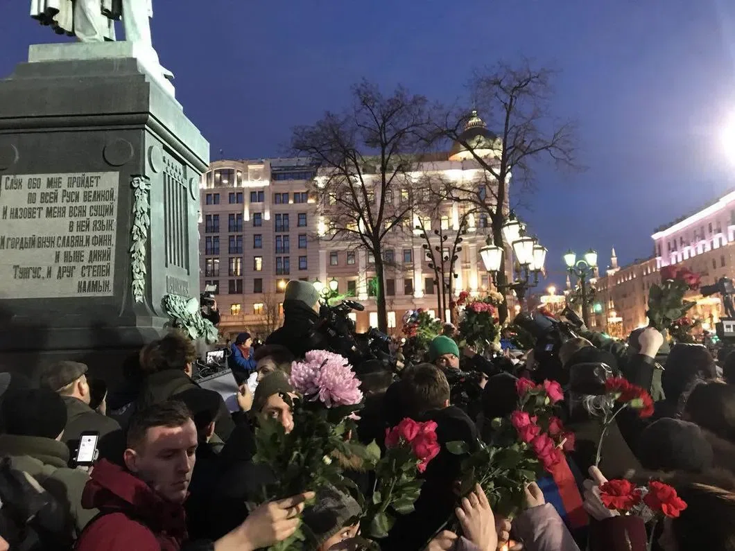 По ее словам, у самого памятника Пушкину устроен импровизированный мемориал: «Люди туда передают цветы, игрушки, пролезть туда сложно. Тоже через голову люди передают ящики с красными лампадками».