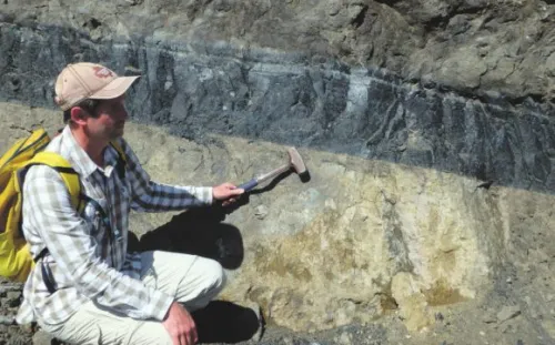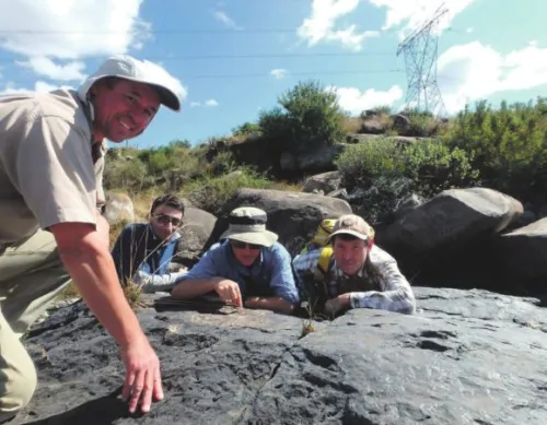 Раис Латыпов возле слоя хромита в Бушвельдском комплексе