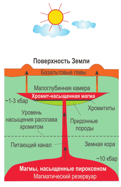 Дело в том, что содержание хрома даже в насыщенной хромитом базальтовой магме не превышает 0,1–0,2 массового процента. Следовательно, хромиты должны были каким-то образом выделиться и сконцентрироваться из очень большого количества такой магмы. Но как это могло произойти?