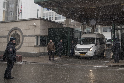 Фото: Россия. Москва. 23 марта 2018. Автомобили британских дипломатов покидают территорию посольства в Москве. Решение о высылке 23 дипломатов было принято российскими властями как зеркальная мера на фоне обострения отношений между Россией и Великобританией в связи с отравлением бывшего полковника ГРУ Сергея Скрипаля и его дочери в Солсбери. Pavel Golovkin/АР/ТАСС