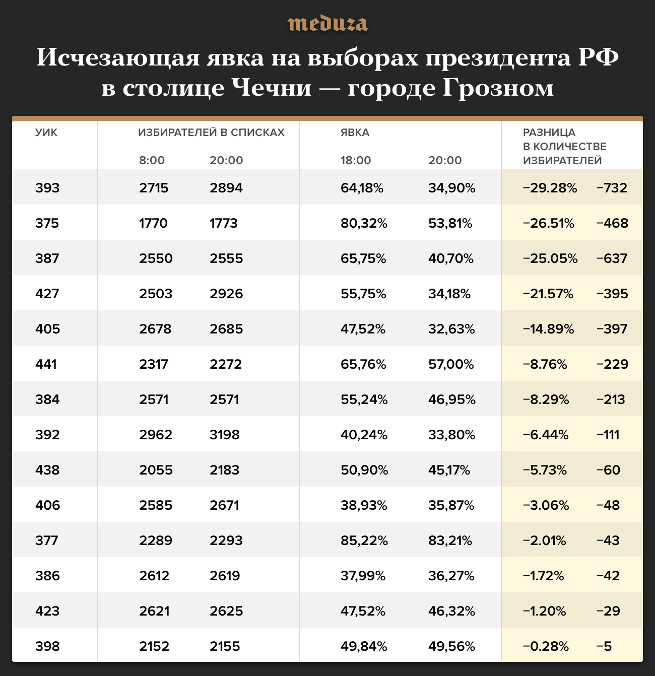 Поправка. В материале первоначально утверждалось, что в двух случаях отрицательная динамика явки в Чечне фиксировалась на участках без наблюдателей. Но в УИКах № 386 и № 392 работали независимые наблюдатели. Приносим извинения читателям.