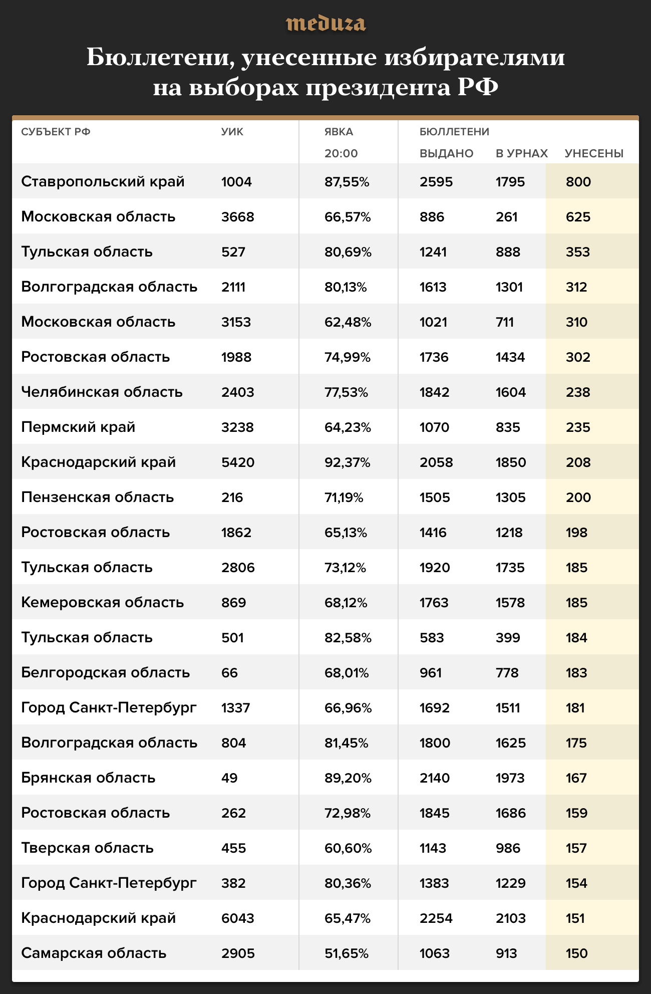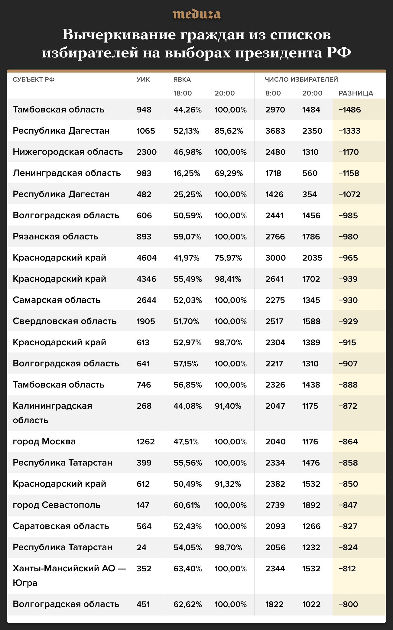 Центральная избирательная комиссия подвела окончательные итоги выборов президента России. Результаты кампании были зафиксированы в государственной автоматизированной системе «Выборы» с точностью до избирательного участка. «Медуза» изучила эти данные и обнаружила аномалии: где-то исчезли сотни бюллетеней, а где-то — сотни избирателей.