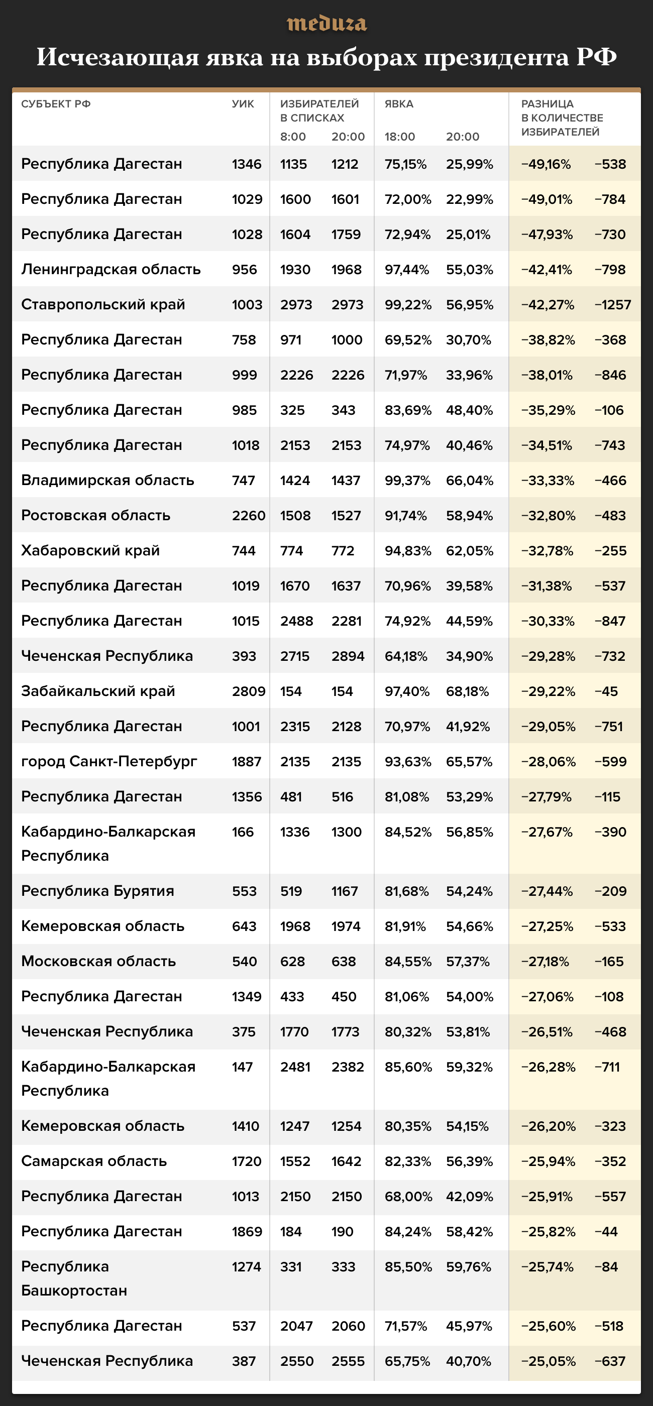 Аномалия. На многих участках финальная явка избирателей оказалась меньше промежуточной, зафиксированной за два часа до окончания голосования. Если пересчитать потерянный процент на живых избирателей, то разница может составлять от нескольких человек до нескольких сотен человек на одном участке. Это много — учитывая, что всего в списке избирателей на участке обычно 1,5-2,5 тысячи человек. Также подозрительно, что значительная часть участков, где выявлена аномалия, находится в одном регионе — Дагестане.