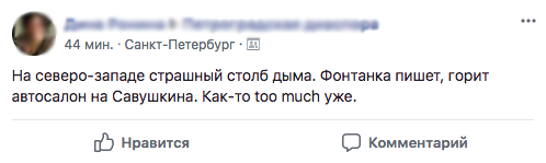 «Бумага» подсчитала сообщения о пожарах в соцсетях и СМИ. Например, в паблике «ДТП и ЧП. Петербург», который ежедневно сообщает о десятках городских происшествий, за сегодняшний день таких постов было не больше, чем в среднем за предыдущую неделю.