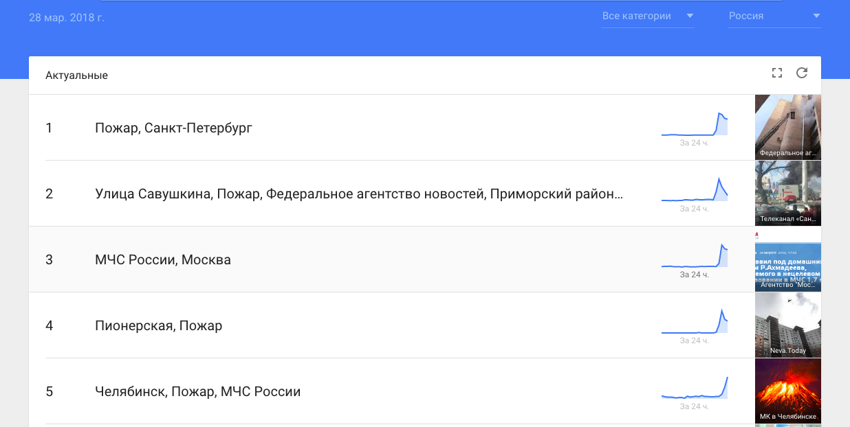 К 19:10 пожар на Савушкина вышел в топ Google Trends по России. На четвертом месте оказался пожар на Коломяжском. В топе были также запросы о пожаре в Киеве, Мурманской области, Москве.