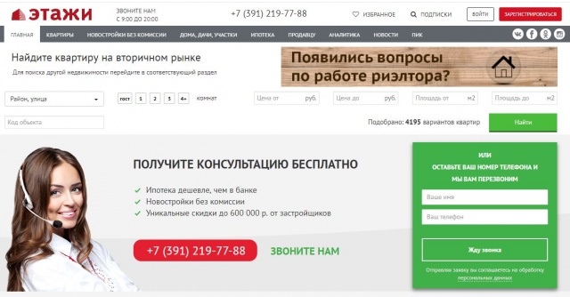 На двух страницах располагаются 7519 вариантов квартир в разных районах г. Красноярска.