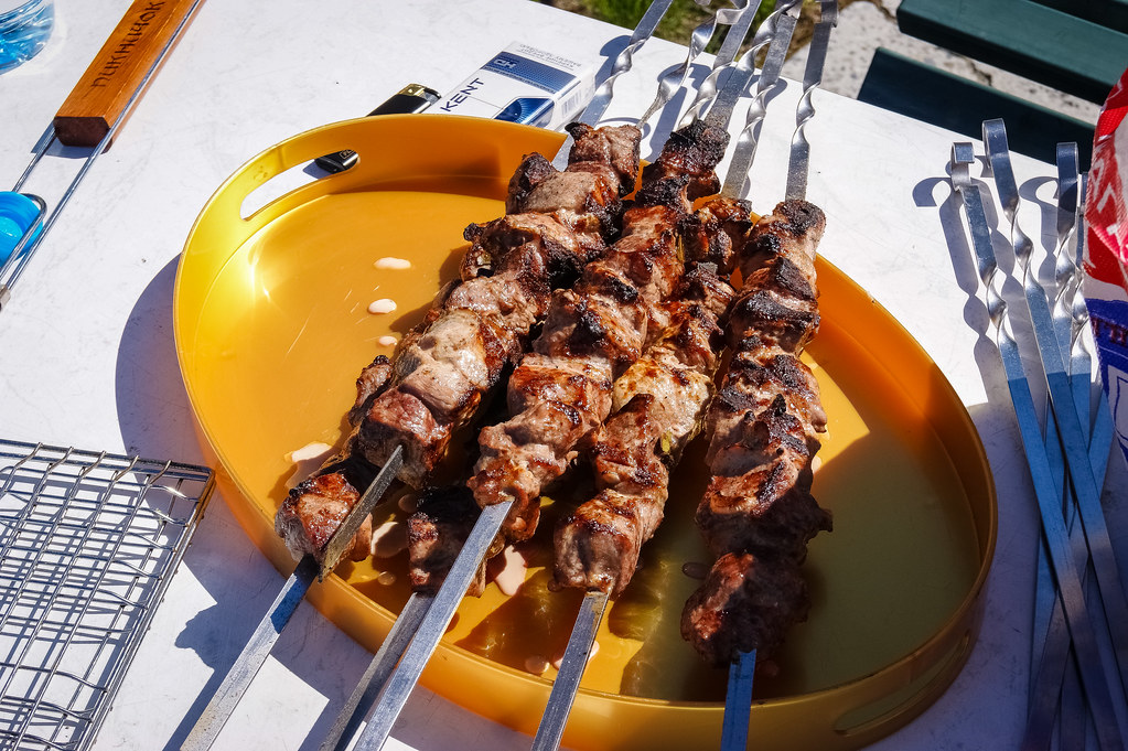 07 - царь-блюдо прошлых, нынешних и будущих лет - шашлык! Кура, мясо, рыба, овощи - чо угодно, но обязательно чтобы на шампурах и над углями их хорошенечко подержать. Попробуйте, кстати, смесь соевого и киви для маринада - результат вас приятно удивит!