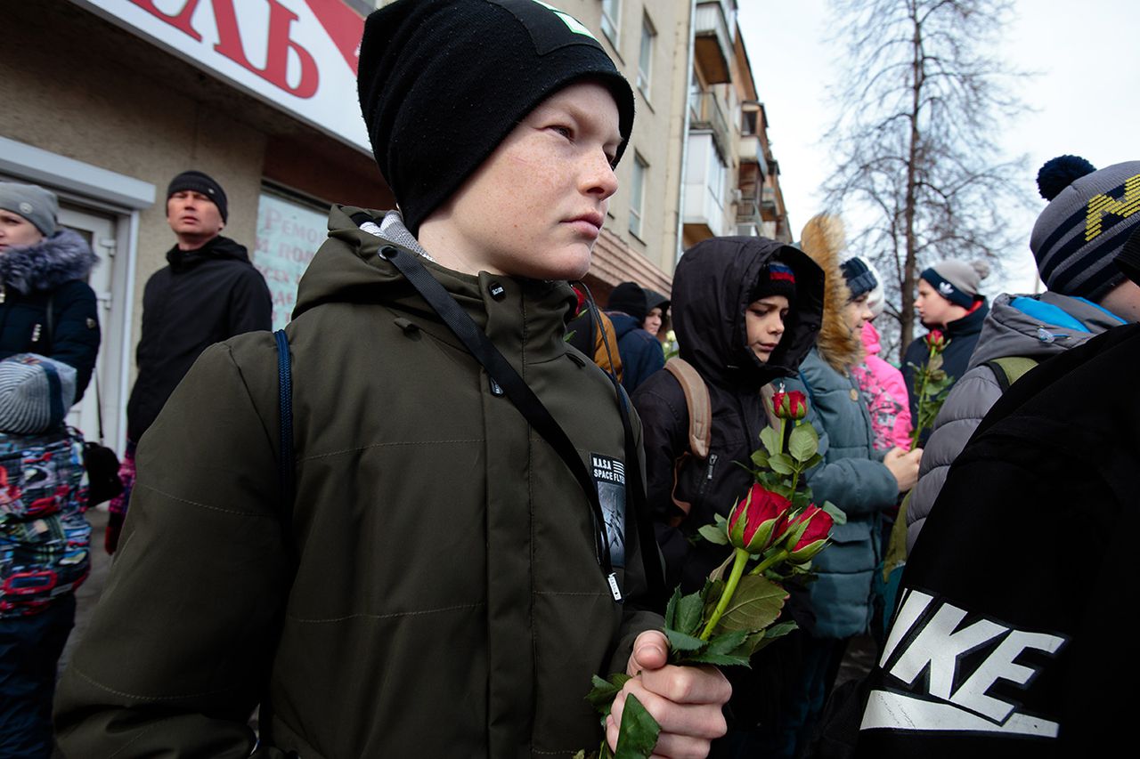 Люди на площади Советов скандируют: «Пу-ти-на!». Собравшиеся знают, что президент уже приехал в город и возложил цветы на мемориале рядом с «Зимней вишней». На записи президентского визита видно, что Владимир Путин идёт к мемориалу, вокруг которого вторые сутки постоянно стоят люди, в окружении мужчин в чёрных пальто и костюмах. Стоит возле мемориала он совершенно один.