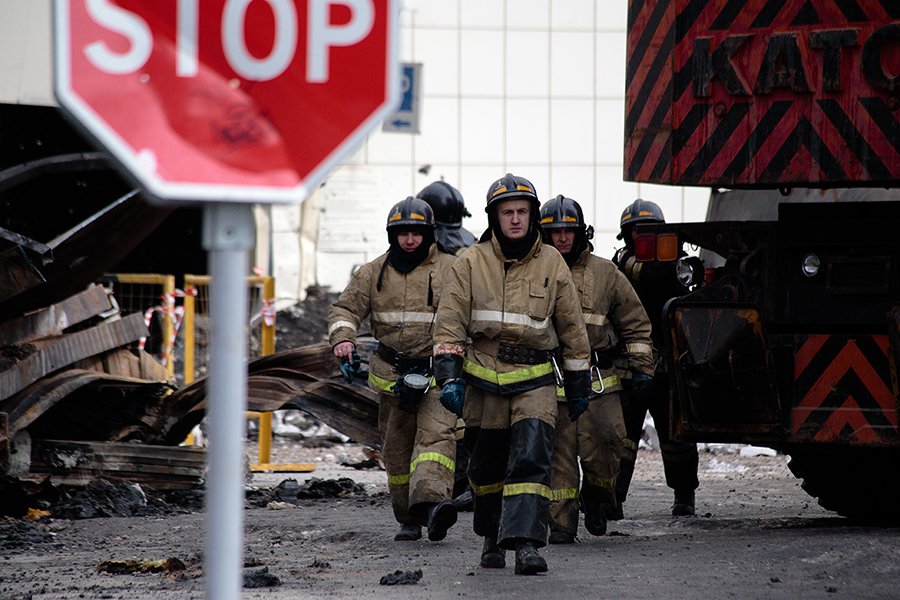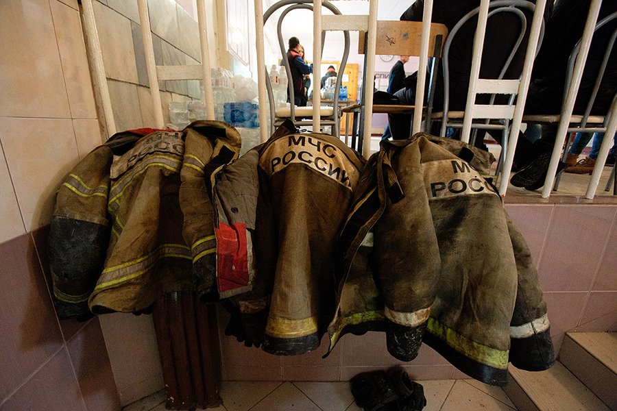 На крыльце курит спасатель из Москвы, только что вышедший из «Зимней вишни». У него растрёпанные волосы и измазанное гарью лицо.