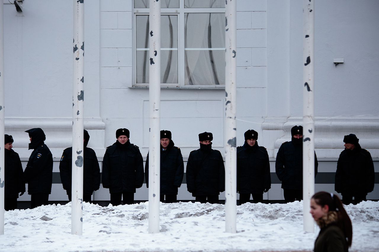 — Вам что, жертв мало? Не рекомендую, — показывает Цивилёв на омоновцев, стоящих на входе в здание.