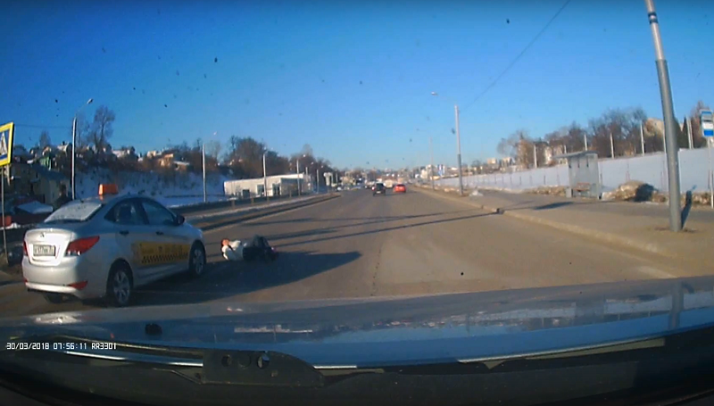 На нём отчетливо видно, как пешеход, визуально можно опознать, что это женщина, переходит дорогу на переходе в районе пересечения Лыбедской магистрали с улицей Батурина. Ей уступили дорогу два автомобиля, но такси, ехавшее по левой полосе на скорости сбивает женщину. Удар был настолько сильным, что пешеход подлетел и перевернулся в воздухе после столкновения.