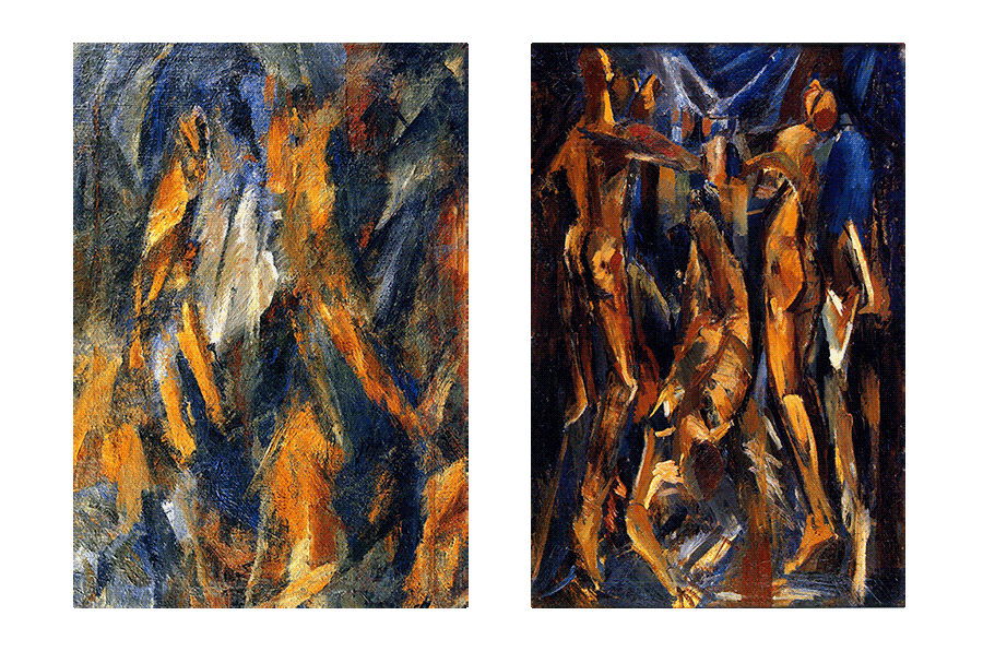 Слева: Василий Чекрыгин. Претворение плоти в дух, 1913 год. Справа: Василий Чекрыгин. Три фигуры, 1914—1915 годы