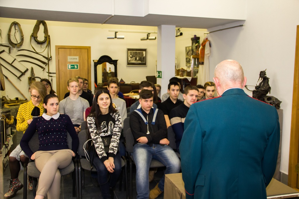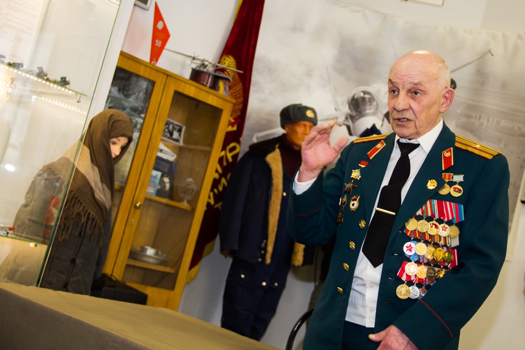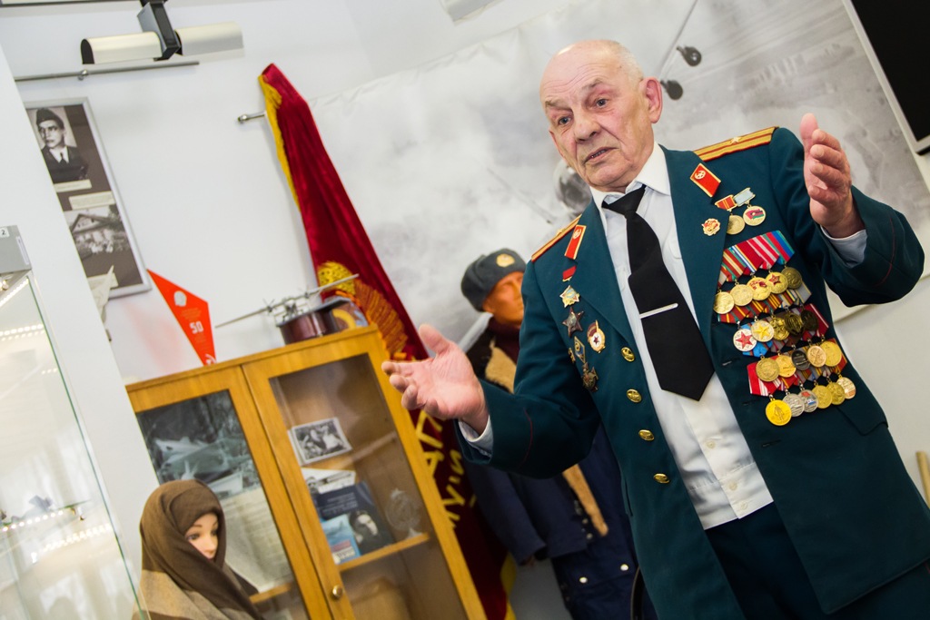 Группа студентов обходит экспозицию Музея Дзержинского района, посвященную военным конфликтам (оружие, форма, карты, сухпаек), а потом рассаживается на стулья послушать ветерана Афганистана Виктора Парахневича. Его периодически приглашают на такие встречи — он не отказывает: старается рассказать молодежи об Афганской войне, чтобы «воспитать патриотов».