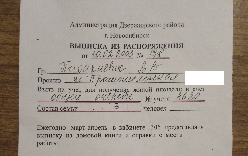 Когда Парахневича ставили на учет нуждающихся в жилье, он был 2620-й в общей очереди и 44-й — в льготной, афганской. На учет его взяли с составом семьи три человека: он, жена и дочь. Это было в 2003 году — тогда они втроем уже были прописаны у тещи на Промышленной. Это важно, потому что, когда администрация Дзержинского района снимала афганца с учета, то считала его семьей уже шесть человек — к жене и дочери добавили тещу, сестру жены и племянницу.