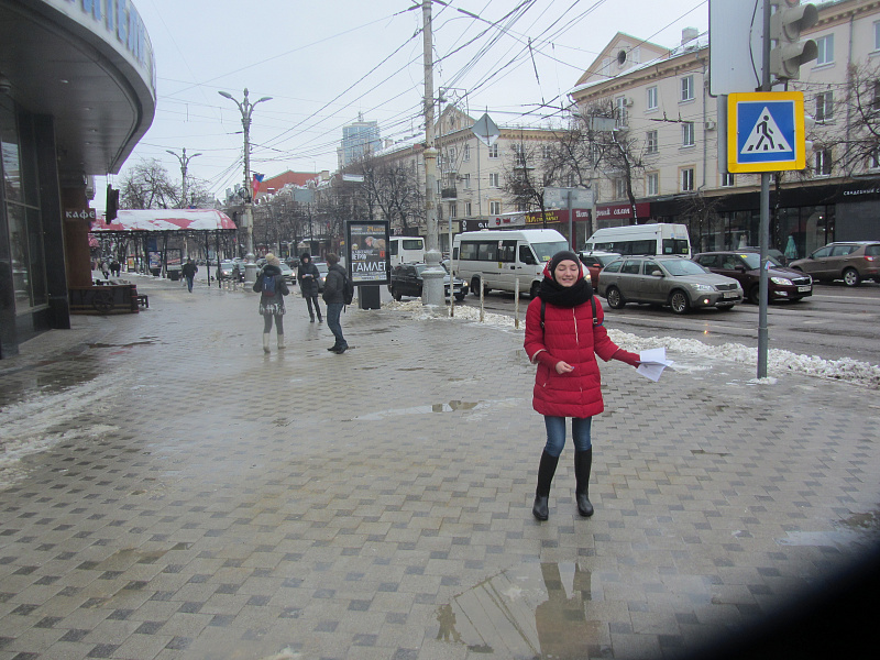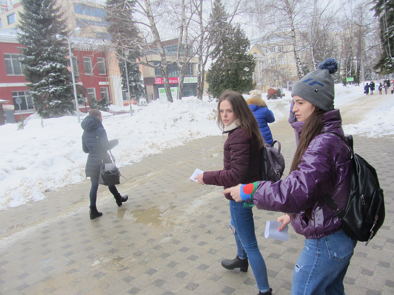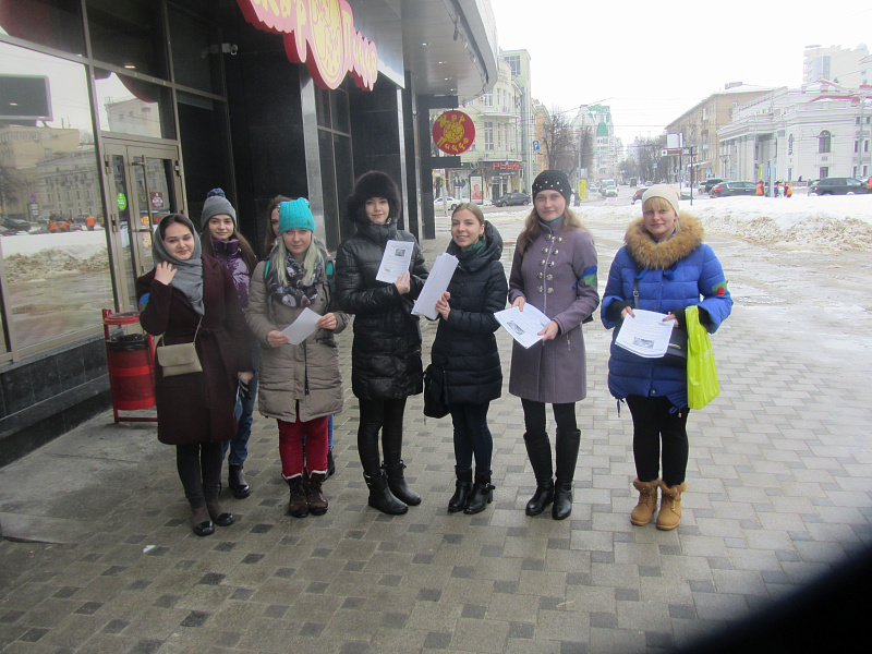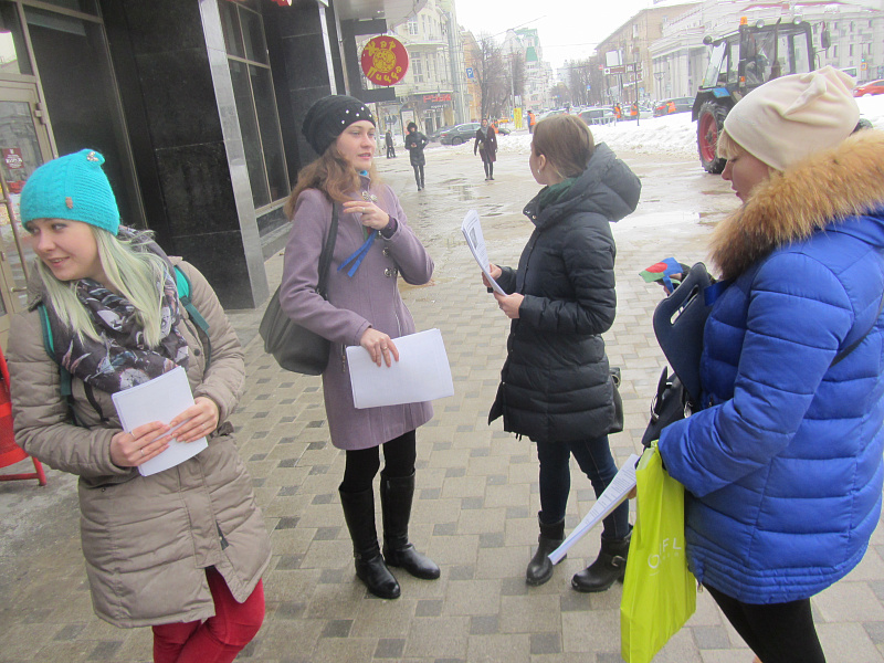 В назначенное время подходит активистка Центра реабилитации диких животных Юля. Она раздает листовки участникам акции, и мы приступаем. Многие студентки принимают участие в этой акции уже не первый раз! Они быстро занимают места по углам площади Никитина и на прилегающих улицах.