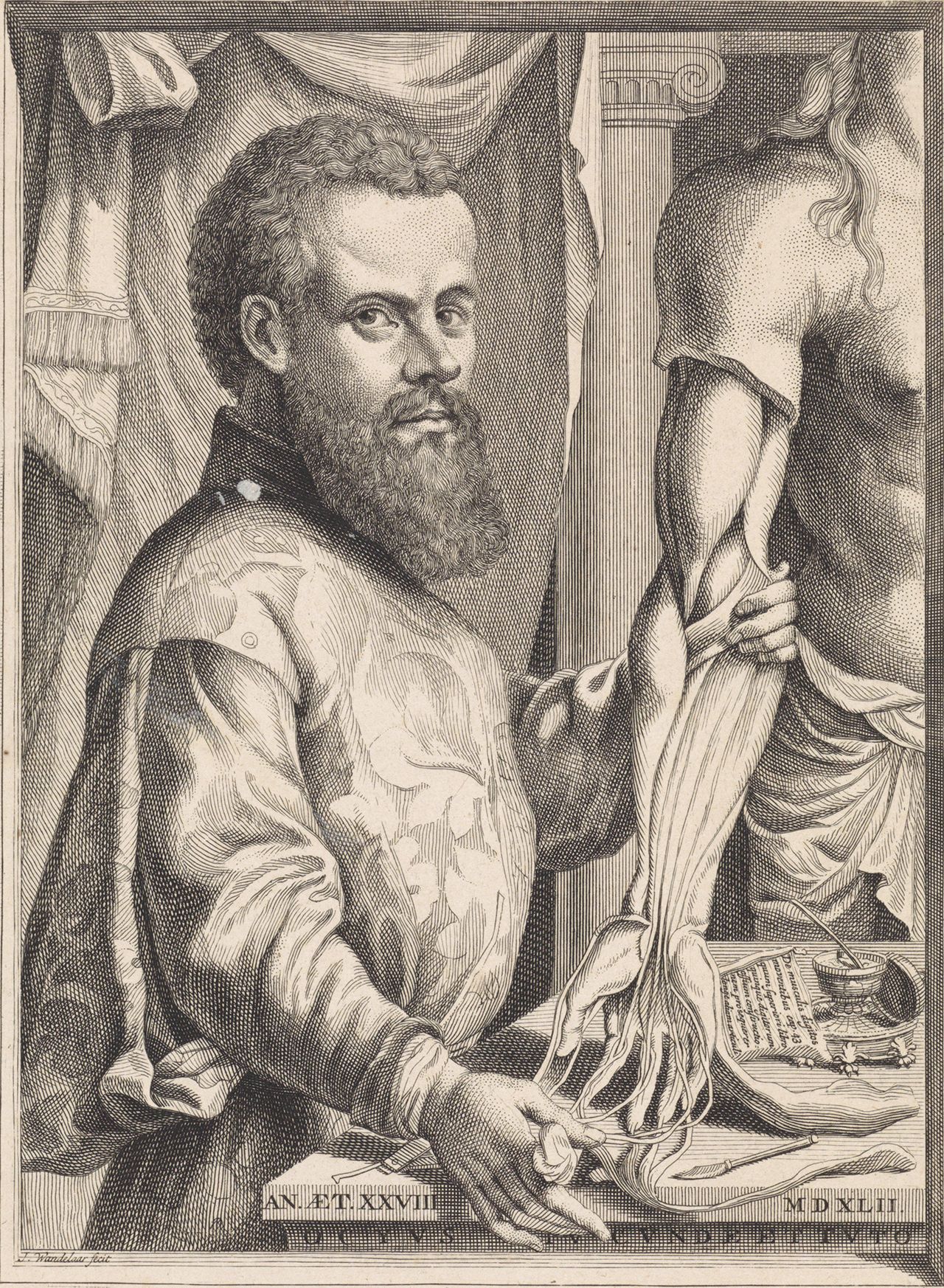 Выбор сюжета с рукой был определен не этимологией, а знаменитым предшественником Тюлпа, Андреасом Везалием (1514–1564), поместившим в первом издании своего классического труда «De humani corporis fabrica» («О строении человеческого тела») напротив титульной страницы свой ставший не менее классическим портрет. На нем Везалий препарирует кисть руки. На столе перед ним лежит латинский текст Галена, в котором описываются движения пальцев руки. Видны те же мышцы и сухожилия, что и на рембрандтовском портрете Тюлпа. Везалий как бы подчеркивает слабое место в исследованиях Галена, который, описывая мышцы, исходил из анатомии кисти обезьяны, а не человека