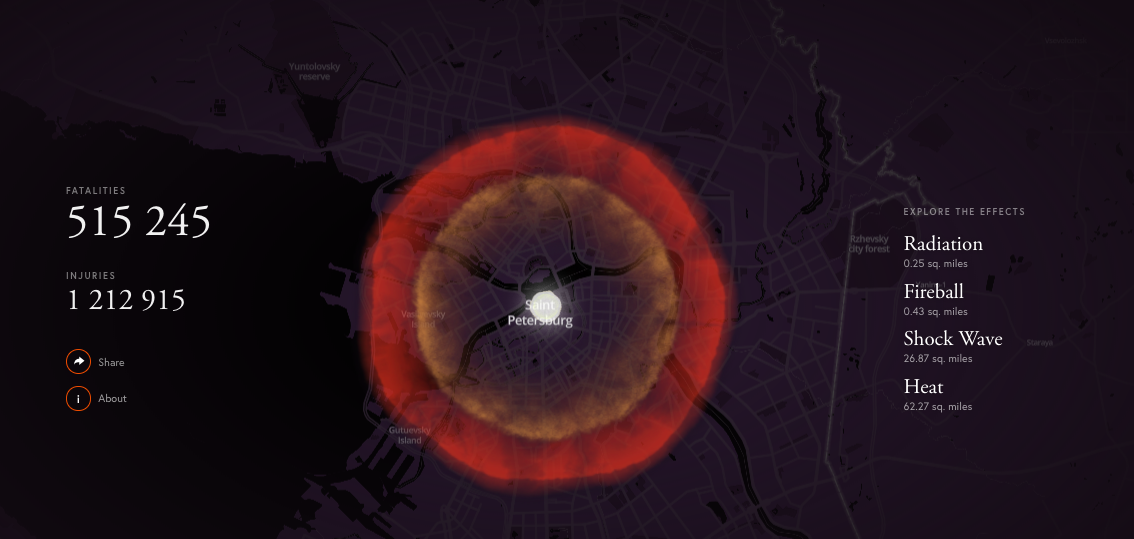Например, сервис показывает, что если бомба с зарядом в 300 килотонн упадет неподалеку от «Дома книги» на Невском проспекте, то погибнет больше 500 тысяч человек, еще больше миллиона будут ранены. Площадь поражения радиацией составит 0,6 кв.км, а пламенем охватит все в радиусе 161 км.