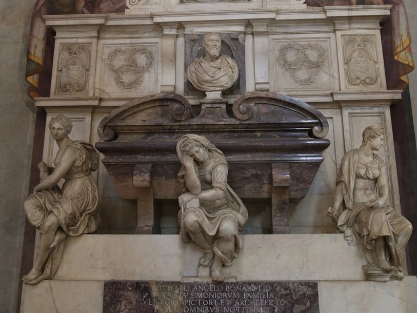 Надгробие же Микеланджело украсили работы других скульпторов. Усыпальница семейства Буонарроти находится во второй капелле правого нефа церкви Санта-Кроче. Мраморный саркофаг не содержит тела Микеланджело. Он сам, как и более шести десятков его родственников, похоронен в склепе под полом. Погребения здесь продолжались до 1858 года. Латинская эпитафия переводится так: «Микеладжело Буонарроти из древнего рода Симони, скульптор, живописец, архитектор, окруженный всеобщей славой. Его любящий племянник леонардо похвально перенес из Рима останки в этот великий храм и воздвиг это надгробие при содействии светлейшего Козимо Медичи, великого герцога Тосканы. Лето Господне 1570. Прожил 88 лет 11 месяцев 15 дней».