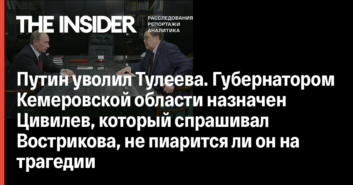 Путин уволил Тулеева. Губернатором Кемеровской области назначен Цивилев, который спрашивал Вострикова, не пиарится ли он на трагедии