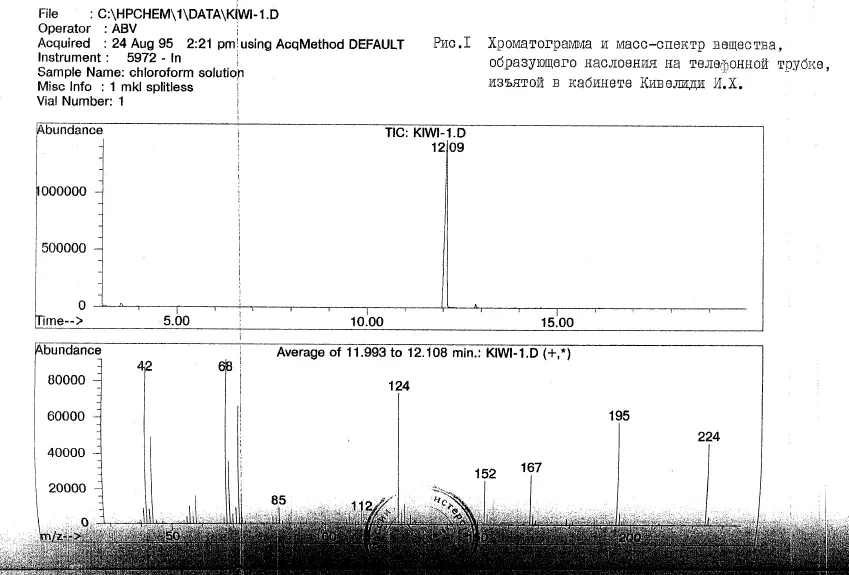 «Вопрос <…> Ринку Л. И.: вам предъявляется хроматограмма вещества, обнаруженного на телефонной трубке из кабинета Кивелиди, полученная в ходе экспертного исследования № 26523 от 04.11.94 г. Соответствует ли данная хроматограмма хроматограмме вещества, изготовленного вами в период, о котором идет речь, и переданная Таланову и другим лицам?