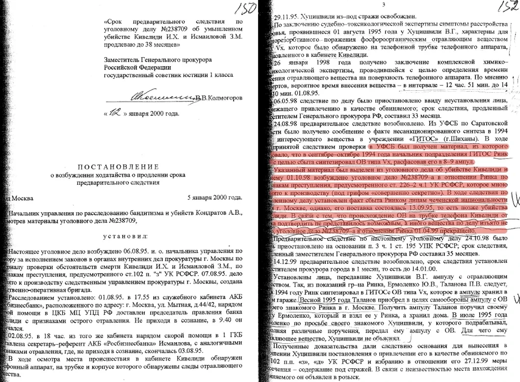 «Из УФСБ по Саратовской области было получено сообщение о факте несанкционированного синтеза в 1994 году интересующего вещества в учреждении ГИТОС (г. Шиханы). В ходе предпринятой следствием проверки в УФСБ был получен материал, из которого следовало, что в сентябре-октябре 1994 года начальник подразделения ГИТОС Ринк с целью сбыта синтезировал ОВ [отравляющее вещество] типа Vx, расфасовав его в 8–9 ампул.