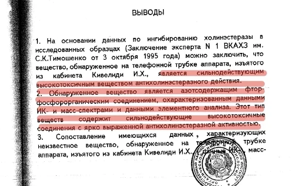 Документы из дела об убийстве Кивелиди свидетельствуют о том, что в 1990-е годы власти потеряли контроль над мощным отравляющим веществом, свойства которого составляли государственную тайну. Посмотрев на экспертизу вещества из материалов дела, два эксперта, которые работали с «Новичком», подтвердили «Новой газете», что в деле говорится о веществе системы «Новичок».