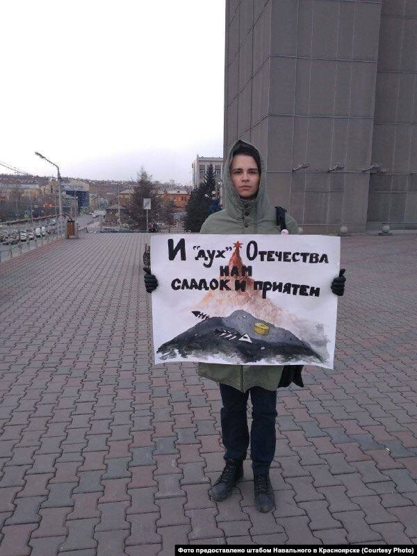 В Красноярске сторонники оппозиционера Алексея Навального 1 апреля провели одиночные пикеты в знак поддержки протеста жителей Волоколамска, где свалочным газом отравились десятки детей.