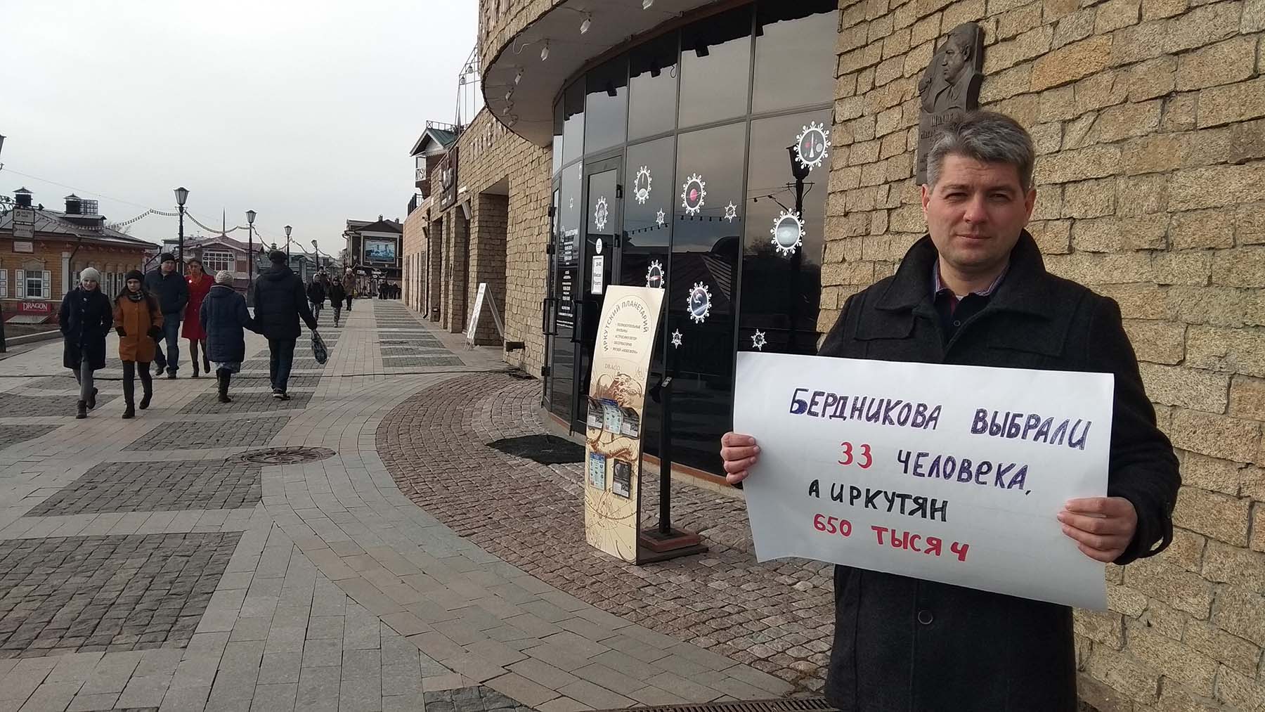 Лозунги у пикетчиков были такие: "Бердникова выбрали 33 человека, а иркутян 650 тысяч", "А в Рио-де-Жанейро люди сами выбирают мэра!", "Я за выборы мэра! Мэр не мэр когда его назначают", "Мы хотим народного избранника, а не избранника олигархов", "Иркутяне способны сами выбрать себе мэра?".