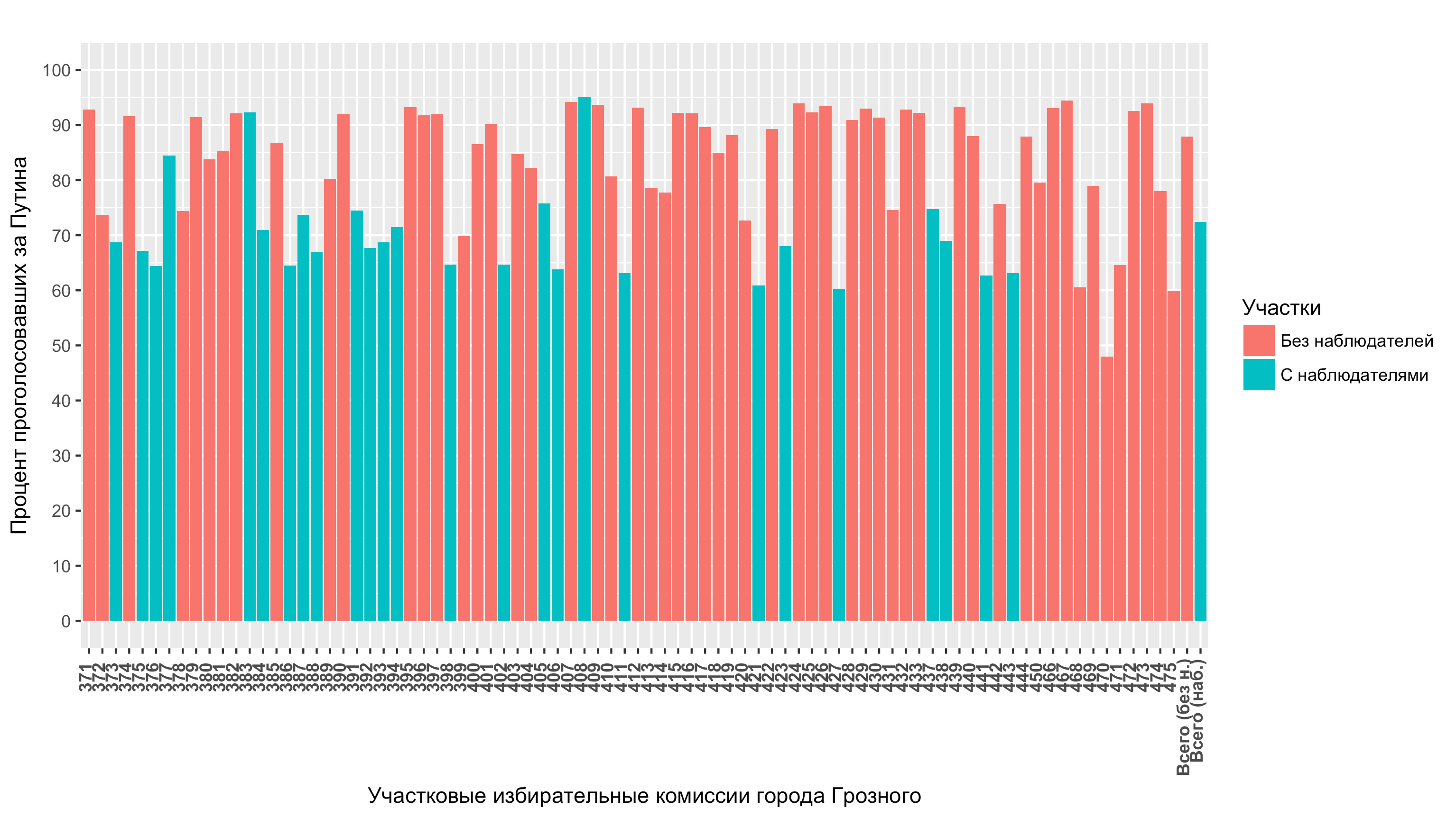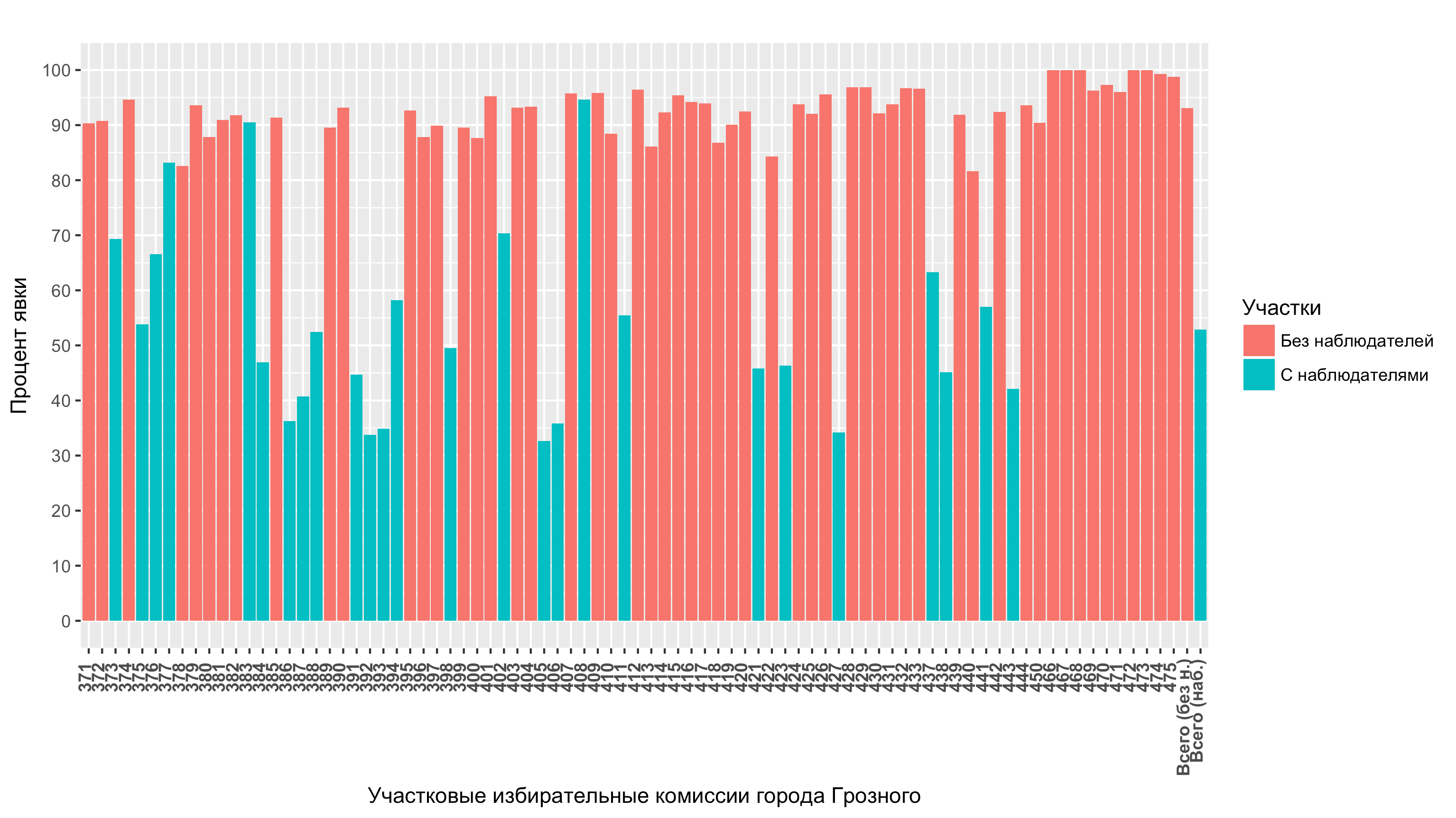 Причины завышения промежуточной явки стали ясны после оглашения финальных результатов. Явка в среднем по республике составила 92%, по Грозному – 77%. При этом средняя явка на грозненских участках без наблюдателей – 93%, с наблюдателями – 53%.