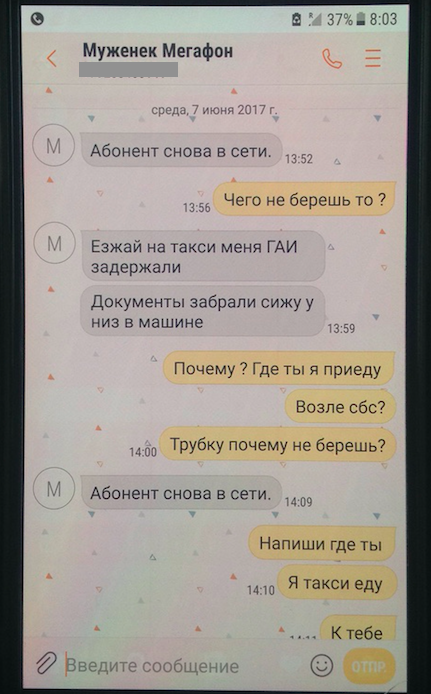 Не дождавшись мужа, Светлана безуспешно пыталась ему дозвониться. «Время час, полвторого, звоню, абонент не абонент. Сколько раз я звонила!» — вспоминает она. Светлана показывает скриншот: в 13:56 телефон включился и ей пришло сообщение: «Езжай на такси, меня ГАИ задержали. Документы забрали, сижу у них в машине». Телефон снова выключился. «У меня было подозрение, что это пишет не он. Там было написано "езжай на такси", а он никогда мне в жизни не говорит "езжай", он мне скажет, жди меня или вообще не ехай. Телефон то включается, приходит сообщение, что он включен, а потом опять абонент не абонент. Пропал, исчез», — Светлана снова заметно волнуется.