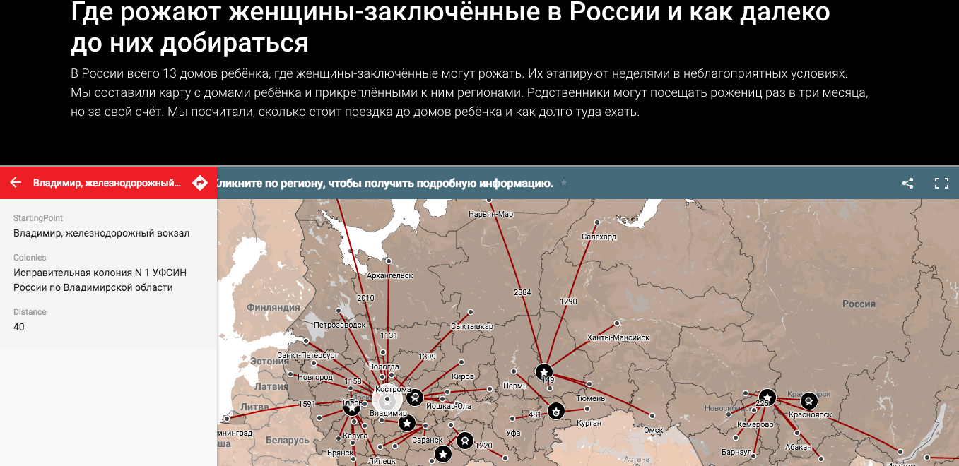 В мультимедийный проект вошли истории женщин, интерактивная карта на основе данных и инфографика. На карте показаны 13 российских домов ребенка, где женщины-заключенные могут рожать, собрана информация о том, как до них добираться и сколько будет стоить поездка для родственников.