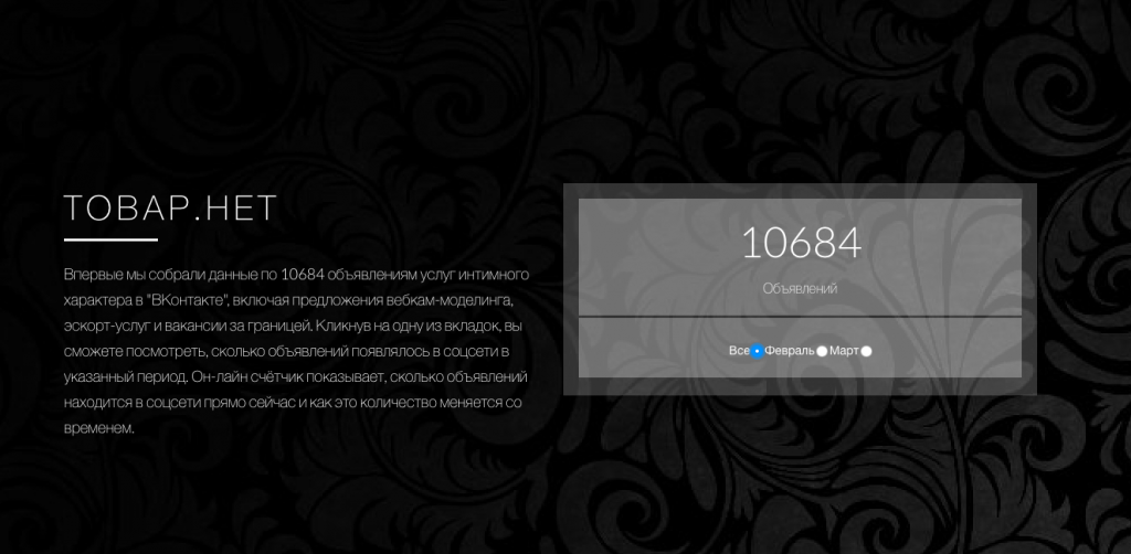 Команда проекта «Товар.НЕТ» собирала и анализировала редкие данные по теневому сектору экономики, а именно посты в социальной сети «ВКонтакте» с предложением работы в сфере сексуальных услуг.